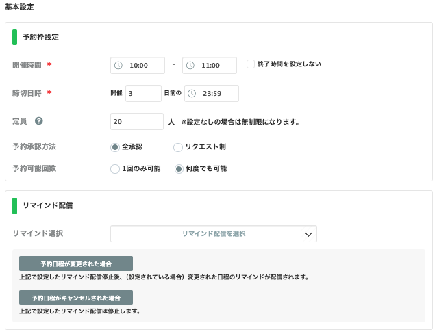 | 予約可能回数 | 同じユーザーが複数回にわたり予約できるかどうかを選べます。 例)初めての方限定のイベントの場合、「一回のみ可能」にする |