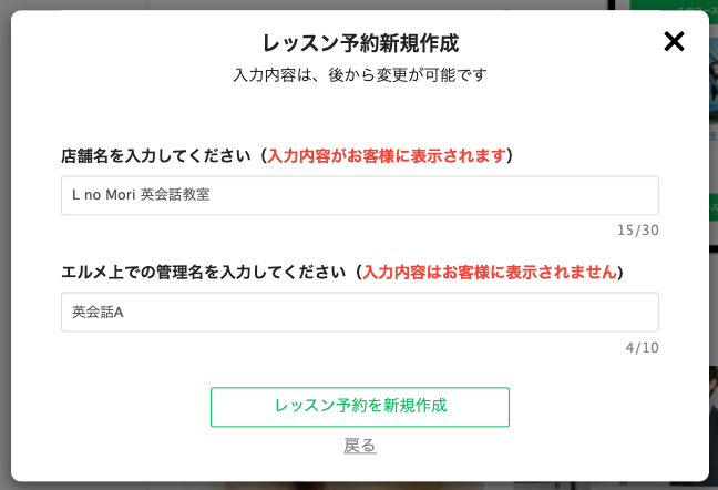 店舗名/管理名を入力>「レッスン予約を新規作成」をクリック