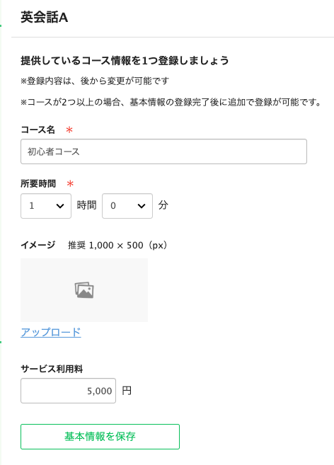 コース名/所要時間/イメージ画像/サービス利用料を入力>基本情報を保存