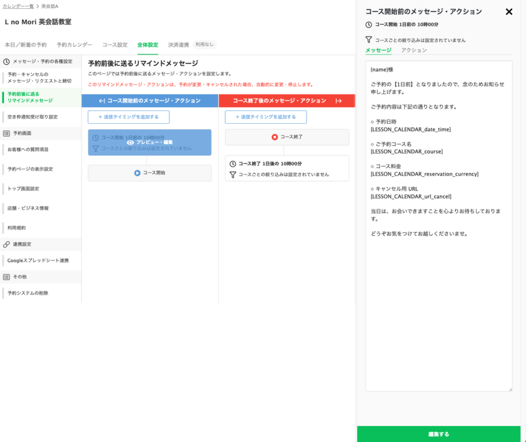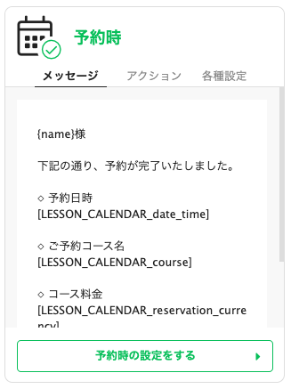 「基本設定・メッセージ」から予約完了時に自動で送信するメッセージを作成できるので、