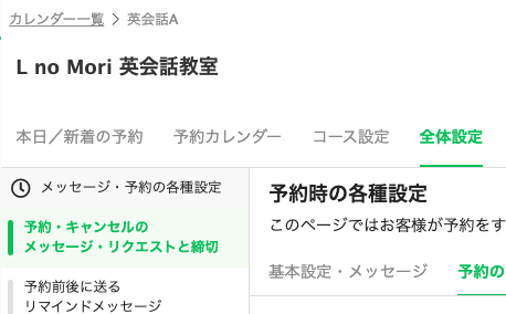 ①レッスン予約の管理画面で「全体設定」を開き、「予約・キャンセルのメッセージ・リクエストと締切」をクリック