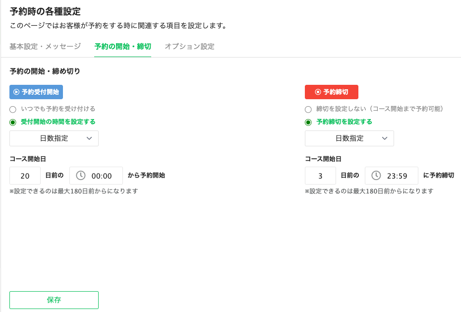 ②「予約時の設定をする」をクリックし、「予約の開始・締め切り」から各自設定して保存