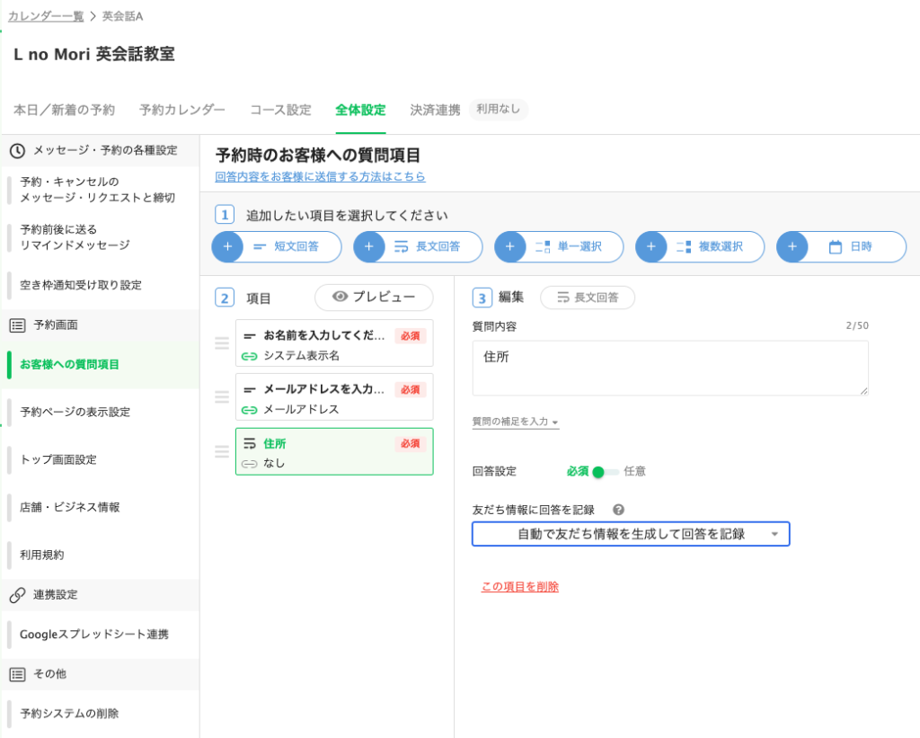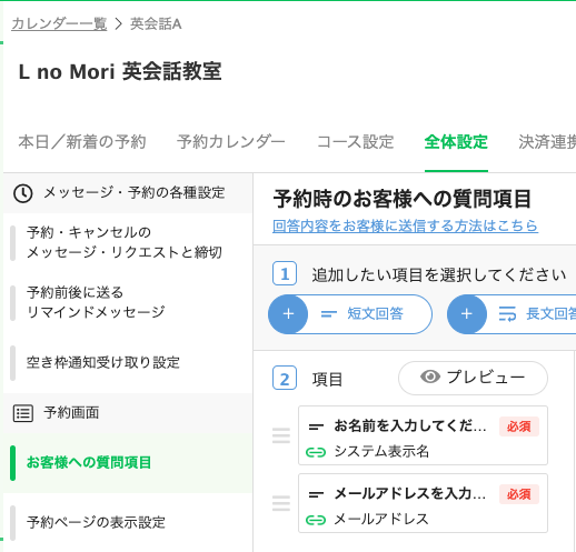 ①レッスン予約の管理画面で「全体設定」を開き、「お客様への質問項目」をクリック