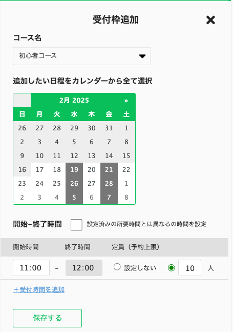 ②「受付枠追加」をクリックし、以下の項目を設定して保存