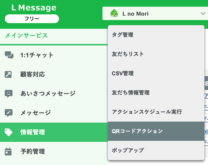 エルメ管理画面にアクセス>情報管理>QRコードアクション>新規作成