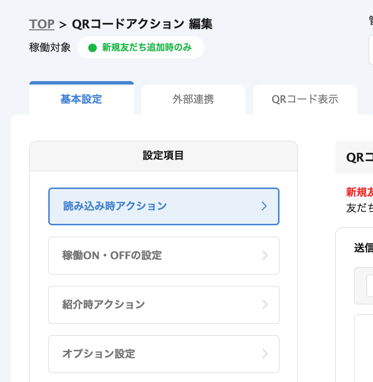 今回個別に設定したい「QRコードアクション」の稼働時に、