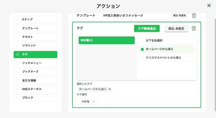 例2)「タグ」から付与させたいタグ名を選び、タグ操作を「選ぶ」にして設定
